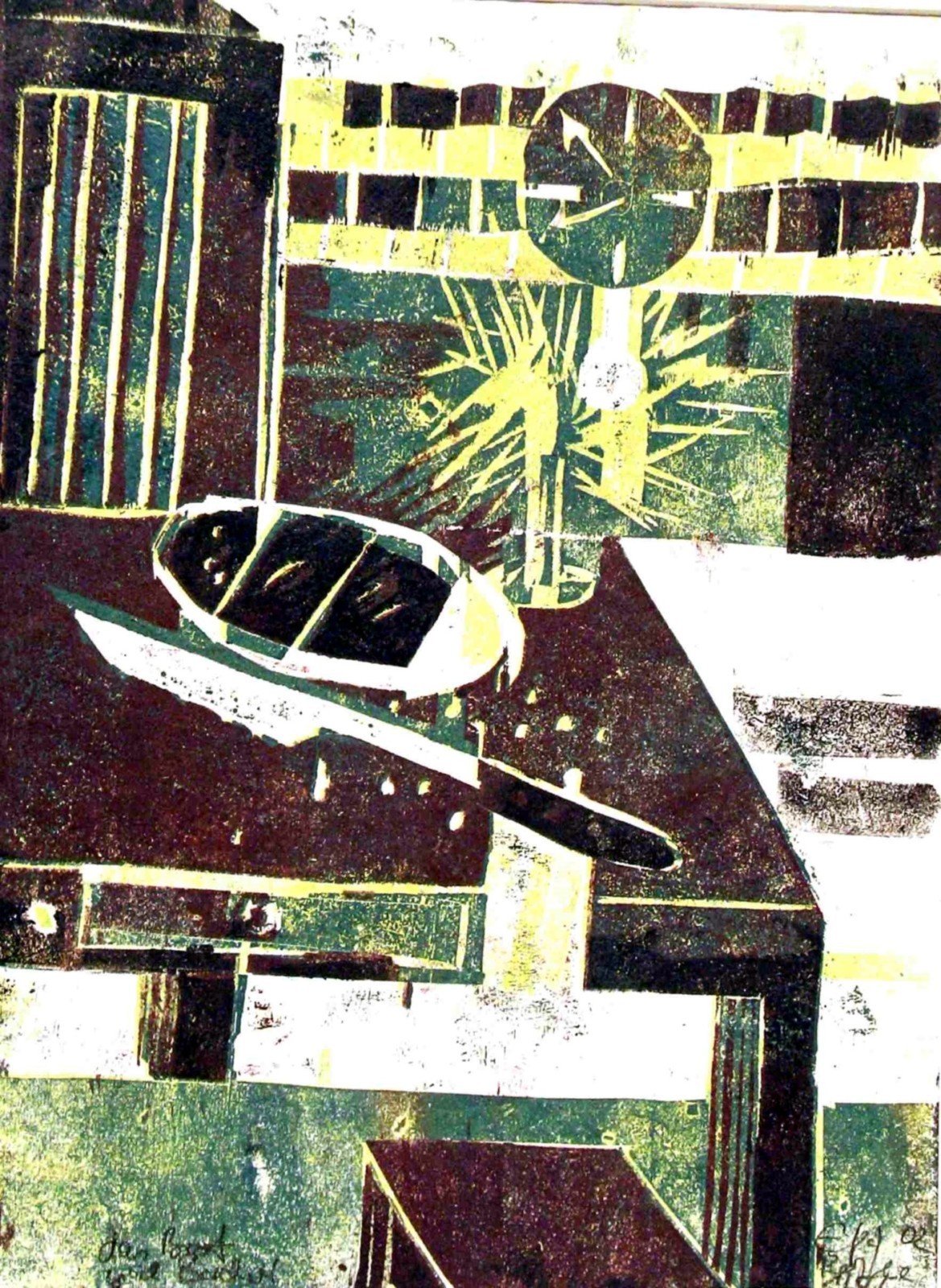 Ein Farbholzschnitt ist Eva Hegi gewidmet, die das Problem der Kleinwüchsigkeit in ihrem Buch „die Andere“ bearbeitet hat. Die „Wachsflügelfrau“ der Schweizer Autorin Evelyn Hasler zeigt sich als Klapprade® und dem Zitat „Worte sind Segel für das Schiff der Zukunft“ (Hasler …Weitere Arbeiten dazu sind geplant. Als nächstes Werk wird „das Schloss“ von Kaffka künstlerisch als Holzschnitt bearbeitet werden und danach „Atemschaukel“ (Herta Müller).