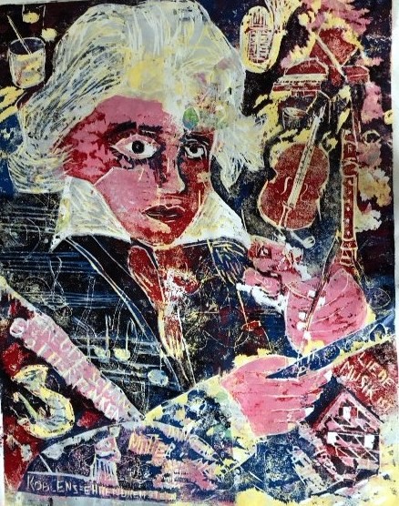 Beethoven hatte eine Großmutter hier in Koblenz-Ehrenbreitstein… ich habe den handgeduckten Farbholzschnitt “Beethoven beim Besuch” im Dezember 2019 hergestellt 130 cm x 100 cm, Aufl. 3 mit Collage