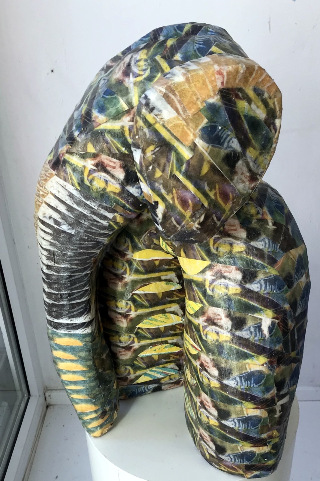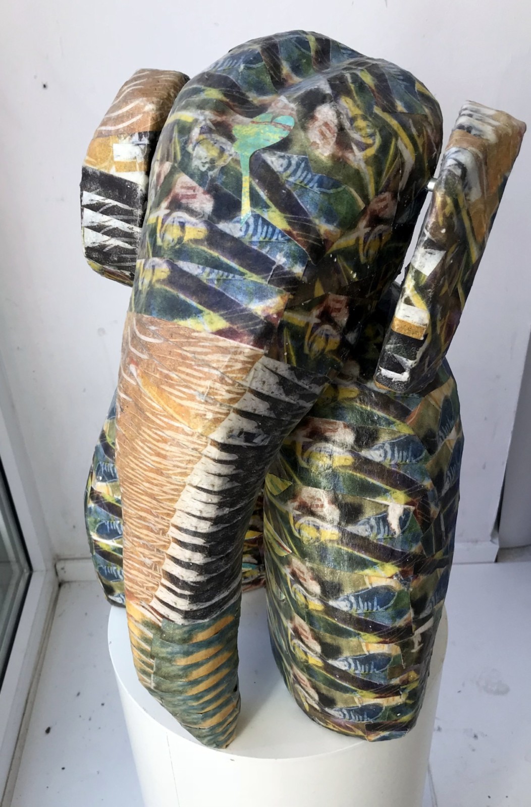 Kleiner KUULlu-Elefant mit wunderschöner Haut aus verschiedenen Papier- und Holzschnittteilchen, 40 cm hoch mit beweglichem Kopf- und Ohrenteil.